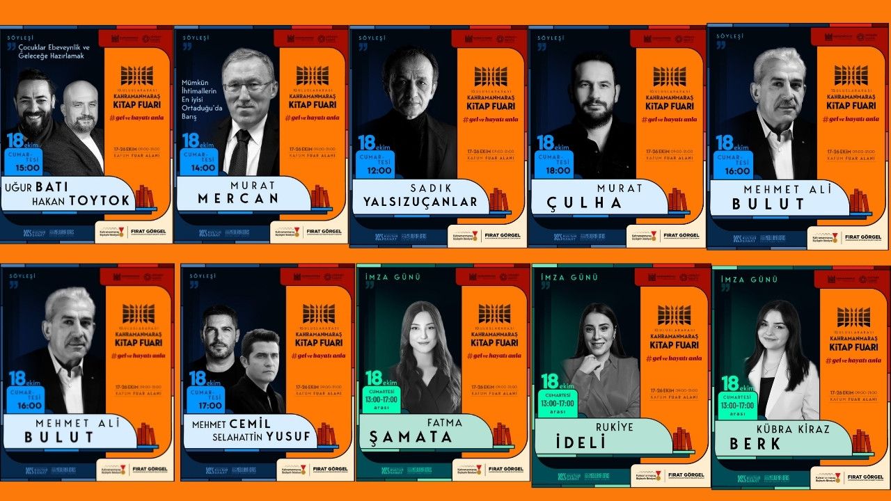 Söyleşilerin yanı sıra, birbirinden değerli isimler 18 Ekim Cumartesi günü imza günü programlarında da kitapseverlerle buluşacak. Rukiye İdeli, Fatma Şamata ve Kübra Kiraz Berk, 13.00 – 17.00 saatleri arasında Alfa Yayınları standında okurlar için kitaplarını imzalayacak. İngiliz çocuk kitabı yazarı Thomas Taylor, Timaş Yayınları standında, Yavuz Ali Bilge ise Damla Yayınları’nda düzenlenecek imza günü programlarında hayranlarıyla bir araya gelecek. Büyükşehir Belediyesinden yapılan açıklamada, 10. Uluslararası Kahramanmaraş Kitap Fuarı’nın ikinci gününde gerçekleştirilecek tüm programlara tüm vatandaşların davetli olduğu belirtildi.