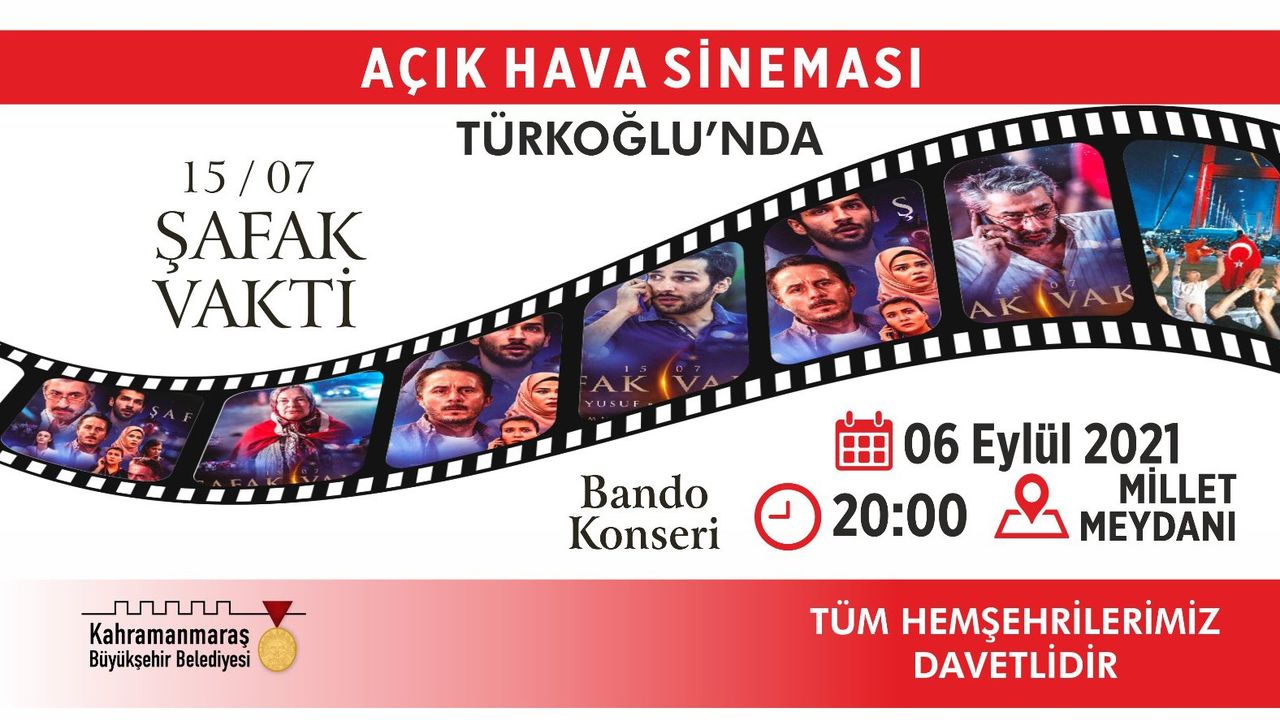 Kahramanmaraş Büyükşehir Belediyesi düzenlediği “Açık Hava Etkinlikleri” ile ilçelerde vatandaşlarla buluşmayı sürdürüyor. Pazarcık, Çağlayancerit, Ekinözü, Elbistan, Afşin ve Göksun’da gerçekleştirilen etkinlikler, bugün Türkoğlu ilçesinde sanatseverlerle buluşacak. Büyükşehir Belediyesi Bando Takımı’nın eserleriyle renk katacağı etkinliklerde, 15 Temmuz’daki demokrasi direnişini beyaz perdeye taşıyan “Şafak Vakti” adlı film de ücretsiz gösterilecek. Türkoğlu’nun “Millet Meydanı” mevkiinde 6 Eylül Pazartesi (Bugün) gerçekleşecek etkinlikler, saat 20.00’da başlayacak.