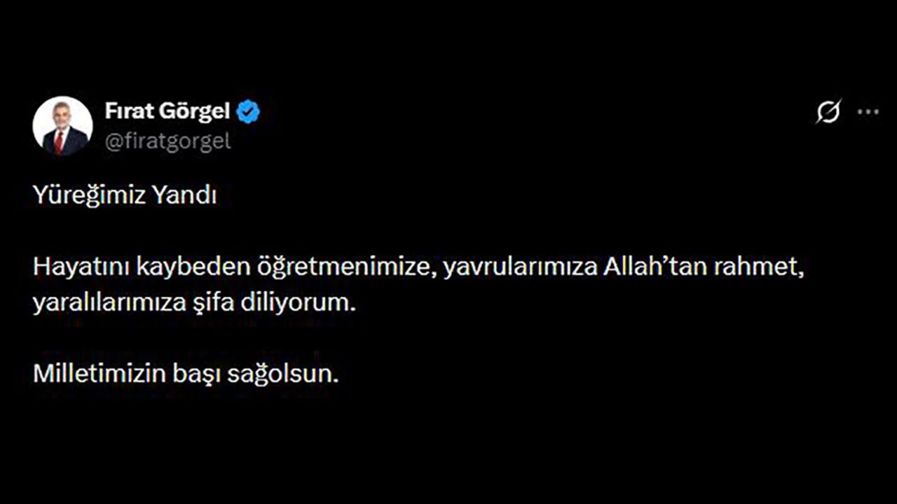 Kahramanmaraş Büyükşehir Belediye Başkanı Fırat Görgel, Onikişubat’taki Ayser Çalık Ortaokulu’nda meydana gelen silahlı saldırıya ilişkin başsağlığı mesajı yayımladı. Büyükşehir Belediye Başkanı Fırat Görgel mesajında, “Hayatını kaybeden yavrularımıza ve öğretmenimize Allah’tan rahmet, kederli ailelerine başsağlığı diliyorum. Yaralanan ve tedavileri devam eden öğrencilerimize de Rabbimden acil şifalar temenni ediyorum. Yüreğimiz yandı, milletimizin başı sağ olsun” ifadelerini kullandı.