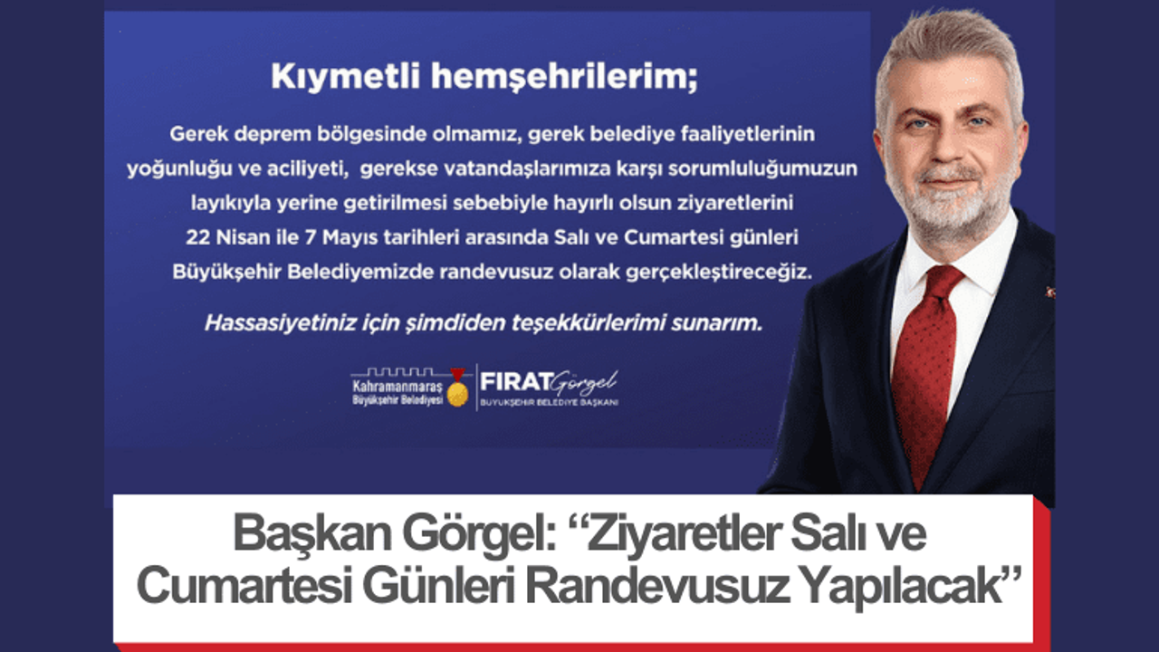 Kahramanmaraş Büyükşehir Belediye Başkanı Fırat Görgel, hayırlı olsun ziyaretinde bulunmak isteyen vatandaşlara yönelik sosyal medya hesabından bir çağrıda bulundu. Başkan Fırat Görgel paylaşımında: “Gerek deprem bölgesinde olmamız, gerek belediye faaliyetlerinin yoğunluğu ve aciliyeti, gerekse vatandaşlarımıza karşı sorumluluğumuzun layıkıyla yerine getirilmesi sebebiyle hayırlı olsun ziyaretlerini 22 Nisan ile 7 Mayıs tarihleri arasında Salı ve Cumartesi günleri Büyükşehir Belediyemizde randevusuz olarak gerçekleştireceğiz. Hassasiyetiniz için şimdiden teşekkürlerimi sunarım” ifadelerine yer verdi.