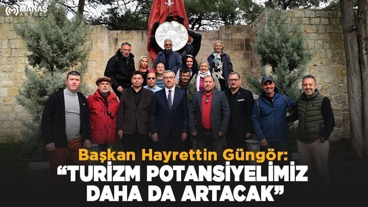 Kahramanmaraş Büyükşehir Belediye Başkanı Hayrettin Güngör, Kahramanmaraş’ın tarihi ve turistik mekânlarını ziyaret etmek için şehre gelen Antalya Rehberler Odası Başkanı Mustafa Yalçınkaya ve turist rehberleri ile Maraş Kalesi’nde bir araya geldi. Misafirlere Maraş Kalesi, Maraş’ın Milli Mücadelesi, Milli Mücadele kahramanları ve şehirdeki diğer turizm alanları ile ilgili bilgiler aktaran Başkan Güngör, “Bugün şehrimizi ziyarete gelen Antalya Rehberler Odası Başkanı Mustafa Yalçınkaya ve turist rehberlerimizi tarihi Maraş Kalemizde ağırladık. Öncelikle kendilerini şehrimizde misafir etmekten duyduğum memnuniyeti ifade etmek istiyorum. Misafirlerimize şehrimiz için çok değerli olan tarihi Maraş Kalemizi, kalemizin Milli Mücadelemizdeki yeri ve önemini anlattık. Ayrıca şehrimizin diğer tarihi ve turistik mekânlarından bahsettik. Şehrimizin turizm potansiyelini artırmayı hedefliyoruz. Bu kapsamda güzel bir görüşme gerçekleştirdik” ifadelerini kullandı.