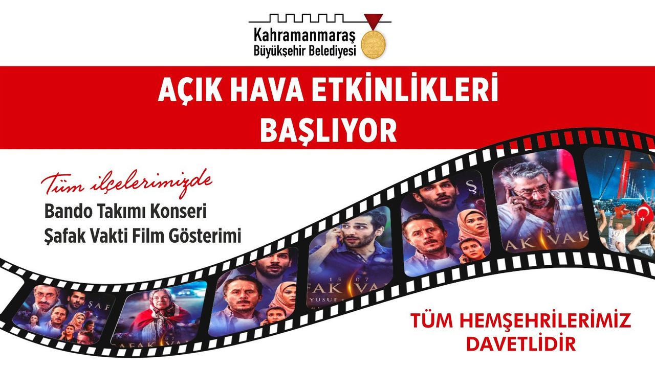 Kahramanmaraş Büyükşehir Belediyesi tüm ilçelerde Açık Hava Etkinlikleri düzenliyor. Programlar kapsamında Büyükşehir Belediyesi Bando Takımı konseri ve Şafak Vakti filminin gösterimi yapılacak. Ücretsiz etkinliklerle, 15 Temmuz’da yaşanan milli direnişi konu edinen Şafak Vakti adlı film vatandaşların beğenisine sunulmuş olacak. Belirlenen takvime göre ilk etkinlik 23 Ağustos Pazartesi günü Türkoğlu Millet Meydanı’nda gerçekleştirilecek. Program kapsamında 19.00’da Büyükşehir Belediyesi Bando Takımı performansının ardından 20.00’da Şafak Vakti filmi açık havada seyirciyle buluşacak. Gerçekleştirilecek etkinlik ile ilgili olarak Büyükşehir Belediyesi Kültür Turizm ve Spor Dairesi Başkanlığı tarafından yapılan açıklamada ücretsiz etkinliklere tüm vatandaşların davet edildiği belirtildi.