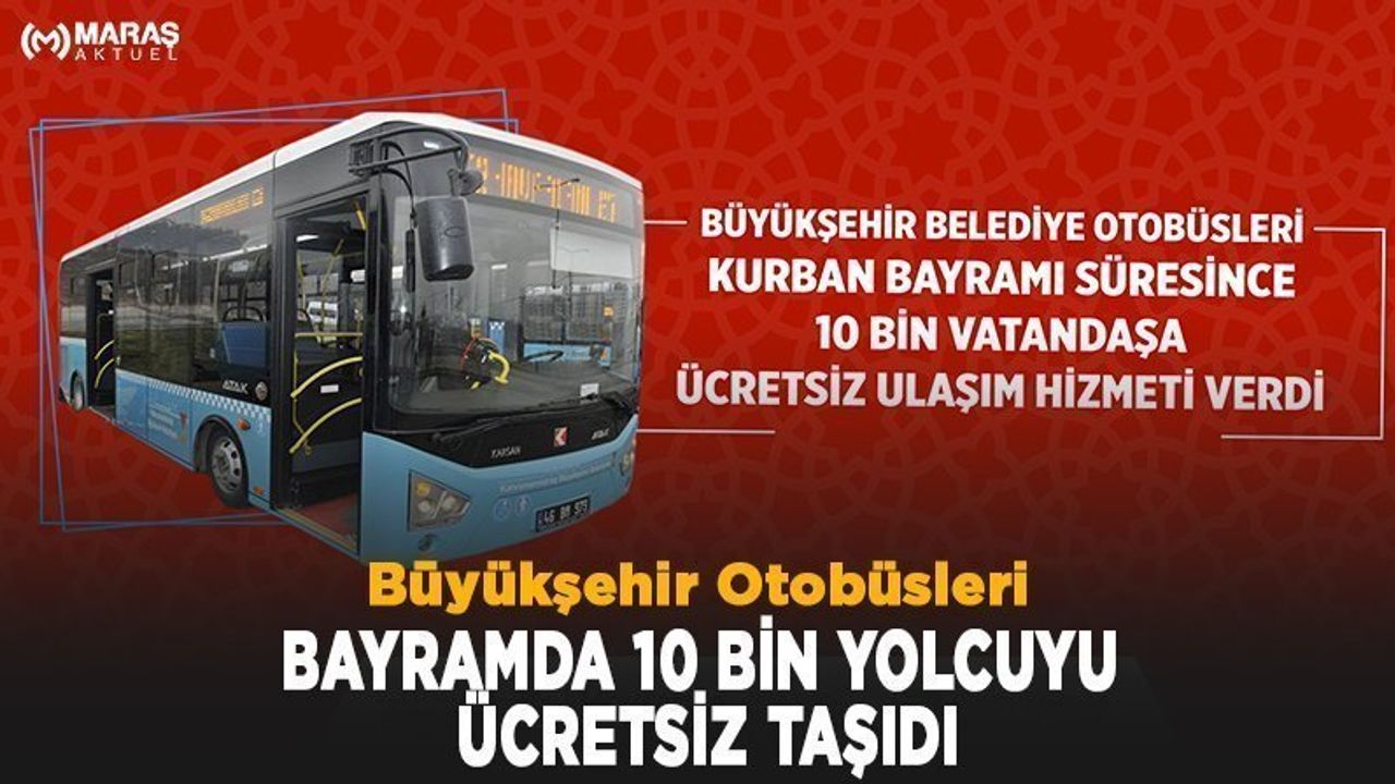 Kahramanmaraş Büyükşehir Belediyesi, sosyal belediyecilik hizmetleri kapsamında çalışmalarını sürdürüyor. Alınan karar doğrultusunda Büyükşehir Belediyesi’ne ait otobüsler Kurban Bayramı boyunca ücretsiz toplu taşıma hizmeti verdi. 9 Temmuz Cumartesi günü saat 00.00’da başlayarak 12 Temmuz 23.59’a kadar devam eden ücretsiz toplu taşıma hizmetinden toplamda 10 bin vatandaş faydalandı. Bayram boyunca 64 araç ile ücretsiz toplu taşıma hizmeti veren Büyükşehir Belediyesi otobüsleri 18 bin 376 kilometre mesafe kat etti. Kurban Bayramı süresince Büyükşehir Belediyesi otobüslerinden ücretsiz olarak faydalanan vatandaşlar, sunulan hizmetten duydukları memnuniyeti belirterek Büyükşehir Belediye Başkanı Hayrettin Güngör’e teşekkür etti.