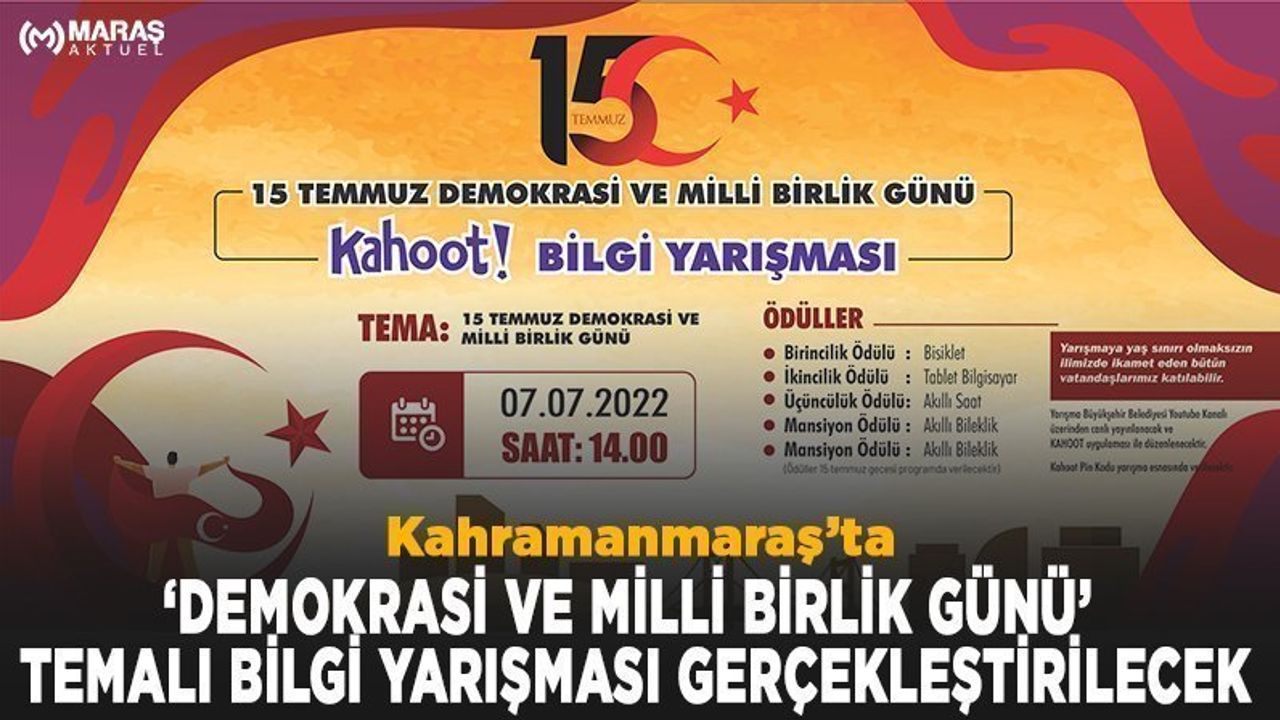 Kahramanmaraş Büyükşehir Belediyesi, çeşitli etkinlikleri vatandaşlarla buluşturmaya devam ediyor. Büyükşehir Belediyesi ve İl Milli Eğitim Müdürlüğü iş birliğiyle ’15 Temmuz Demokrasi ve Milli Birlik Günü’ temalı Kahoot Bilgi Yarışması gerçekleştirilecek. 7 Temmuz Perşembe günü gerçekleştirilecek yarışmaya yaş sınırlaması olmaksızın Kahramanmaraş’ta ikamet eden bütün vatandaşlar katılabilecek. Saat 14.00’te başlayacak yarışma, Kahoot uygulaması üzerinden gerçekleştirilecek ve Büyükşehir Belediyesi Youtube kanalından canlı olarak yayınlanacak.