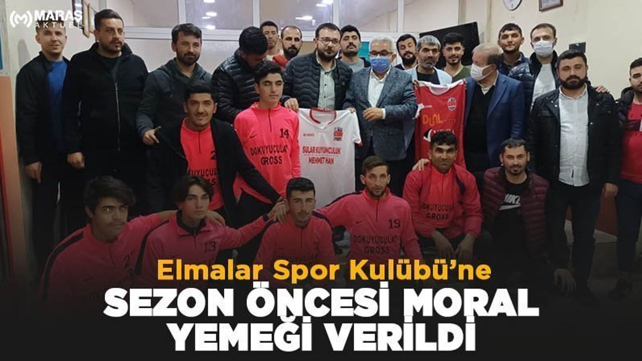 Kahramanmaraş 1. Amatör Küme C grubunda mücadele eden elmalar spor kulübü verilen moral yemeği ile motive oldu. Yemeğe AK Parti Dulkadiroğlu İlçe Başkanı Şahin Avşaroğlu, İlçe Başkan Yardımcısı Osman Ağdaş, AK Parti İlçe Teşkilat ve Gençlik Kolları Üyeleri, Elmalar Mahalle Temsilcisi Hüseyin Kuzu ve Kulübün ana sponsorları olan Tümosan Traktörleri Bölge Bayisi Sayit Sulayıcı, Sular Kuyumculuk sahibi Mehmet Han Sular, Forma Sponsoru Dokuyucular AVM sahibi Cuma Dokuyucu, Dual Bilgisayar Sahibi Mustafa Altun, Erinci Sürücü Kursu Sahibi Eyüp Erinci, eşofman sponsoru Bereket pastaneleri sahibi Mahmut Palalı, Elmalar Spor Kulübü yöneticileri ve futbolcuları katıldı.