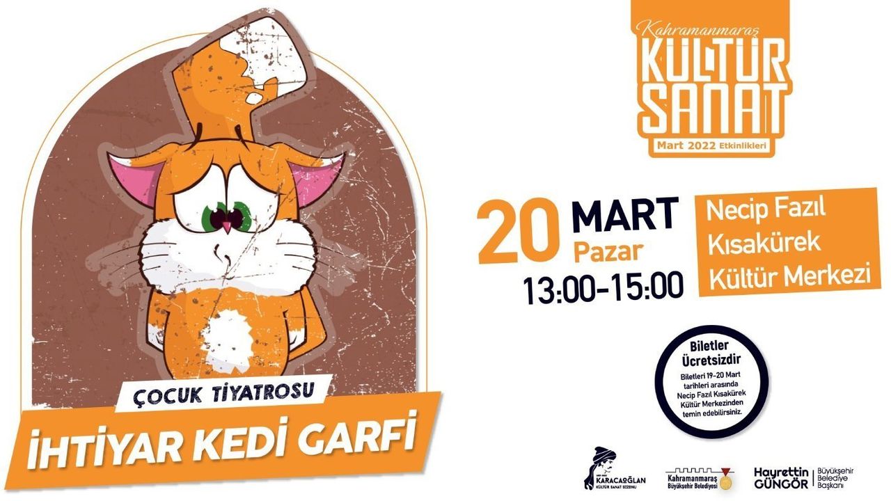 Kahramanmaraş Büyükşehir Belediyesi Mart Kültür Sanat Etkinlikleri kapsamında tiyatro gösterilerinden konsere, konferanstan söyleşiye kadar birbirinden renkli etkinlikler sanatseverlerle buluşturuluyor. Bu kapsamda, 20 Mart Pazar günü (yarın) ‘İhtiyar Kedi Garfi’ adlı çocuk tiyatrosu miniklerle buluşacak. Necip Fazıl Kısakürek Kültür Merkezi’nde düzenlenecek etkinlik saat 13.00 ve 15.00 olmak üzere 2 seans şeklinde sahnelenecek. Yaşlılara saygı ve hürmet, hayvan hakları gibi pek çok değerimizi sahne dili ile miniklere anlatacak olan oyunun ücretsiz biletleri NFK’dan ücretsiz olarak temin edilebiliyor.