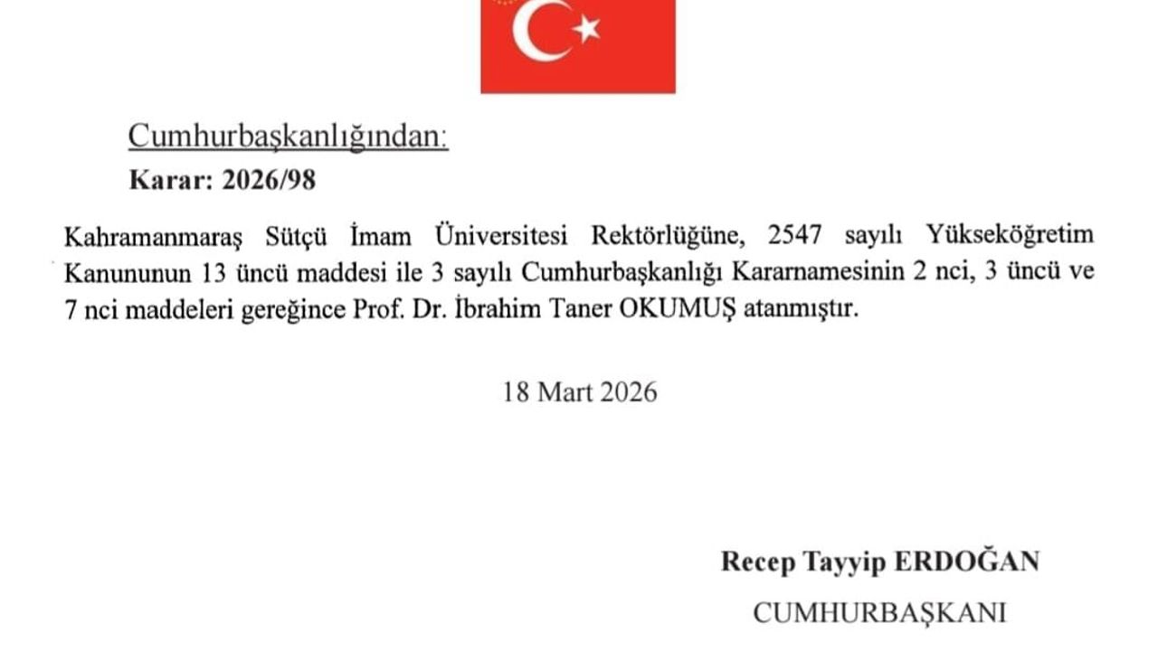 Kahramanmaraş Sütçü İmam Üniversitesi (KSÜ) bünyesinde heyecan veren atama kararı! Cumhurbaşkanı Recep Tayyip Erdoğan’ın imzasıyla yayımlanan 2026/98 sayılı karara göre, KSÜ Rektörlüğü görevine Mühendislik ve Mimarlık Fakültesi Öğretim Üyesi Prof. Dr. İbrahim Taner Okumuş getirildi.