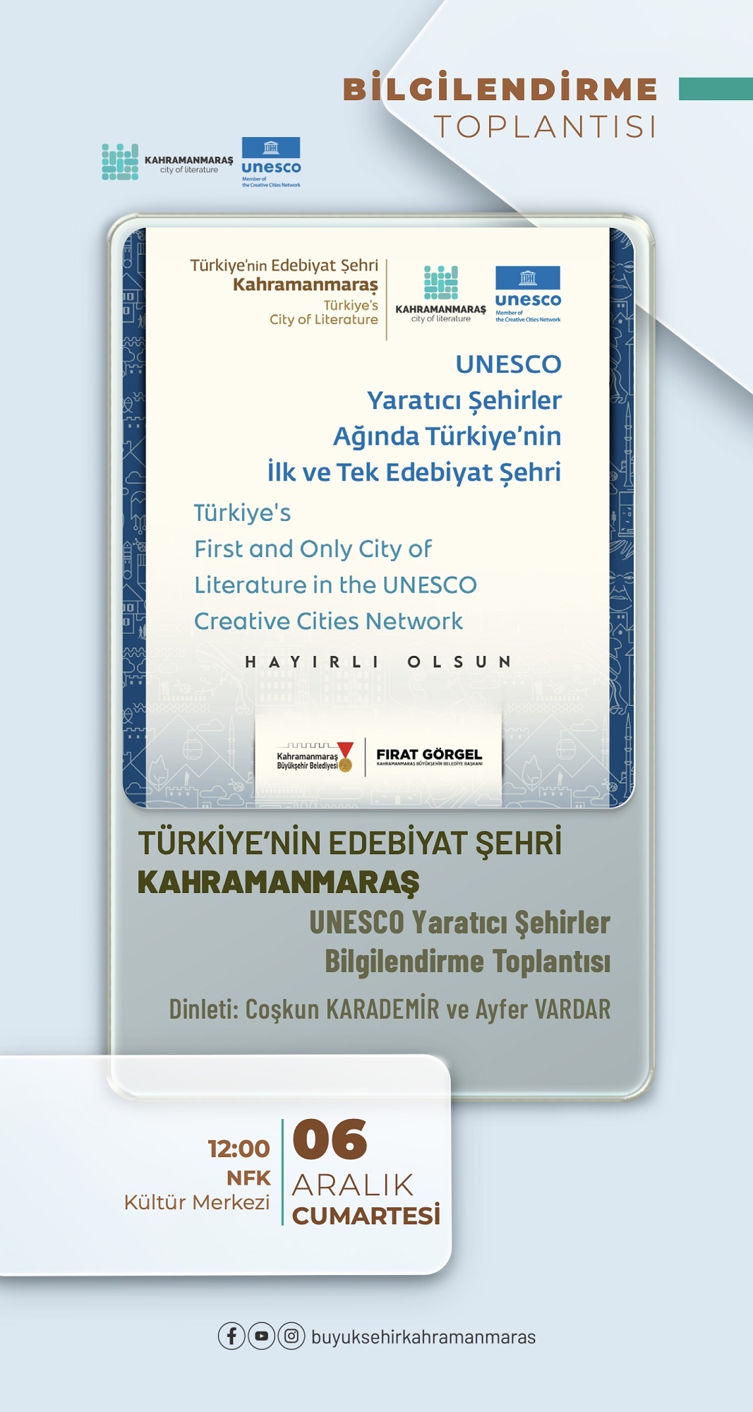 Kahramanmaraş Büyükşehir Belediyesi, sosyal belediyecilik anlayışı çerçevesinde kültür ve sanat etkinliklerini vatandaşlarla buluşturmaya devam ediyor. Türkiye’nin ilk UNESCO Edebiyat Şehrinde kültür sanat faaliyetlerini artırarak sürdüren Büyükşehir Belediyesi, Mevlâna İdris Kültür Sanat Sezonu kapsamında 6 Aralık Cumartesi günü saat 12.00’da Necip Fazıl Kısakürek Kültür Merkezi’nde UNESCO Yaratıcı Şehirler Bilgilendirme Toplantısı gerçekleştirilecek. UNESCO Yaratıcı Şehirler Ağı’na ‘Edebiyat’ alanında Türkiye’den dahil olan ilk şehir Kahramanmaraş’ın güçlü şairlik geleneği, edebi kimliği, ulusal ve uluslararası düzeyde görünür kılınması gibi konular toplantıda ele alınacak. Ayrıca programda sevilen müzisyenler Ayfer Vardar ve Coşkun Karademir’de müzik ziyafeti sunacak. Büyükşehir Belediyesinden yapılan açıklamada, bilgilendirme toplantısı ve müzik ziyafetine tüm vatandaşlar davet edildi.