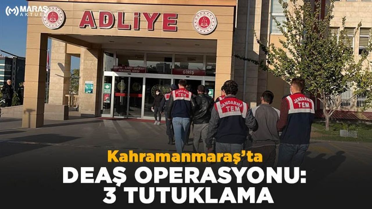 Alınan bilgilere göre, İl Jandarma Komutanlığı ekiplerince, DEAŞ Terör Örgütünün faaliyetlerinin deşifre edilmesine yönelik yürütülen çalışmalar kapsamında, DEAŞ terör örgütü içerisinde Suriye ülkesi çatışma bölgelerinde örgütün silahlı eylemlerine katıldıkları ve müteakiben ülkemize giriş yaparak Kahramanmaraş ve Gaziantep illerinde yaşamaya başladıkları tespit edilen Suriye uyruklu M.K. (30), A.S. (33) ve A.G. (31) eş zamanlı operasyonda gözaltına alındı. Gözaltına alınan şüpheliler, Terörle Mücadele Şube Müdürlüğündeki işlemlerinin ardından sevk edildiği adli mercilerce tutuklanarak cezaevine konuldu.