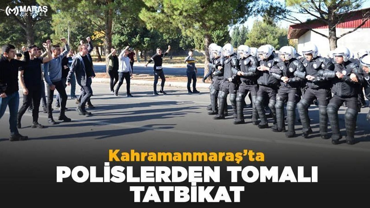 Hanefi Mahçiçek Stadyumu yanında yapılan tatbikatta, senaryo gereği eylemci rolündeki sivil giyimli polisler, sloganlar eşliğinde üniformalı polislere taş, sopa ve molotof kokteyli attı.