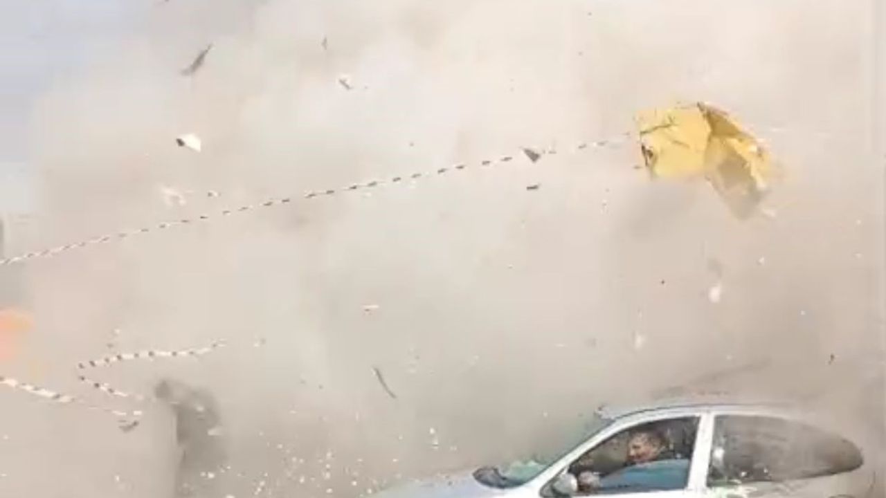 Bu sırada yoldan geçen bir otomobil, binanın çıkardığı yoğun toz bulutu ve savrulan molozlardan etkilendi.