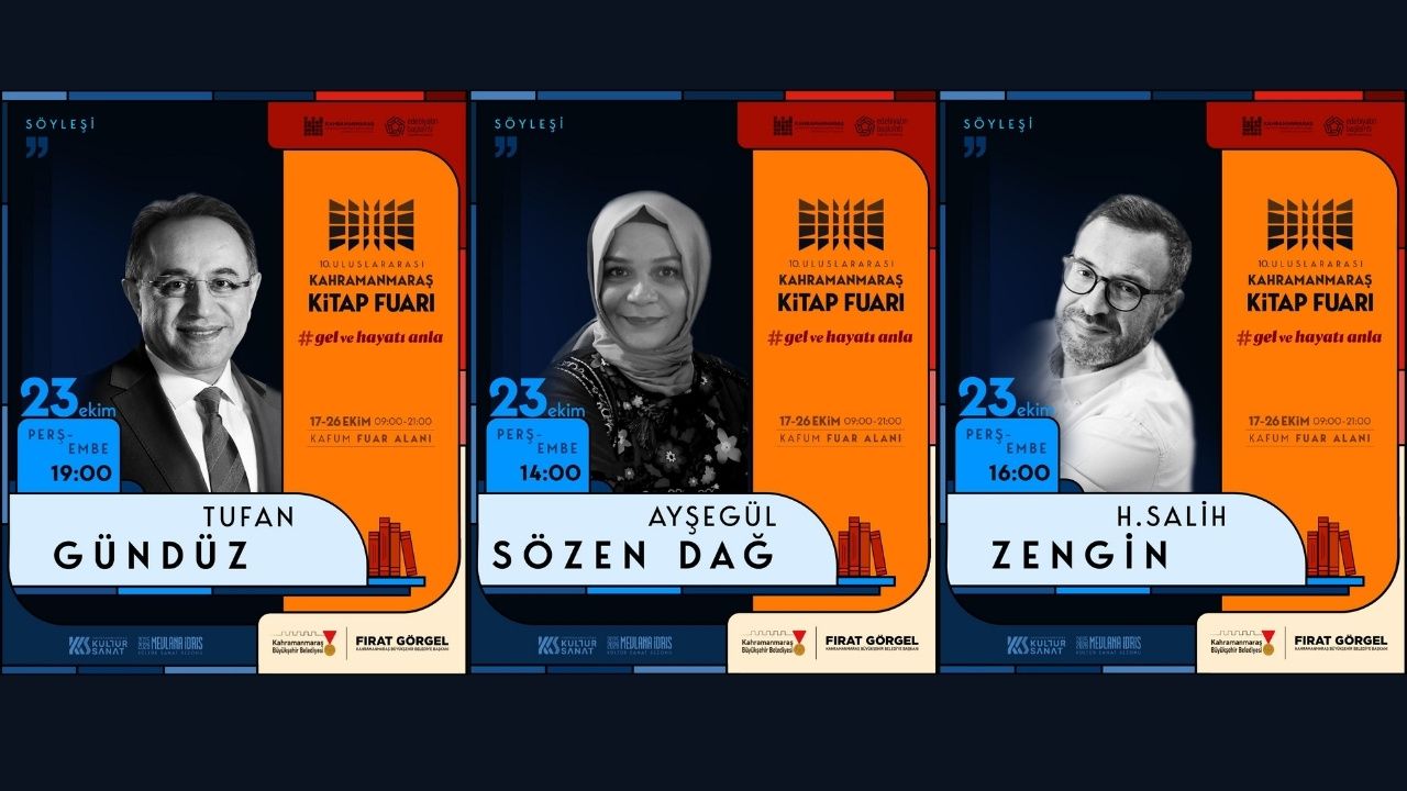 Kahramanmaraş Büyükşehir Belediyesi tarafından bu yıl 10’uncusu düzenlenen Uluslararası Kahramanmaraş Kitap Fuarı, edebiyat dünyasının önde gelen isimlerini bir araya getirerek katılımcılara unutulmaz bir kültür deneyimi sunmaya devam ediyor. Kitap Fuarı’nın yedinci gününde de söyleşiler ve konferanslarla şehrin kültürel nabzını tutmaya devam edecek. 23 Ekim Perşembe günü gerçekleşecek etkinliklerde yazar Ayşegül Sözen Dağ, Salih Zengin ve tarihçi-yazar Prof. Dr. Tufan Gündüz okurlarla bir araya gelecek.