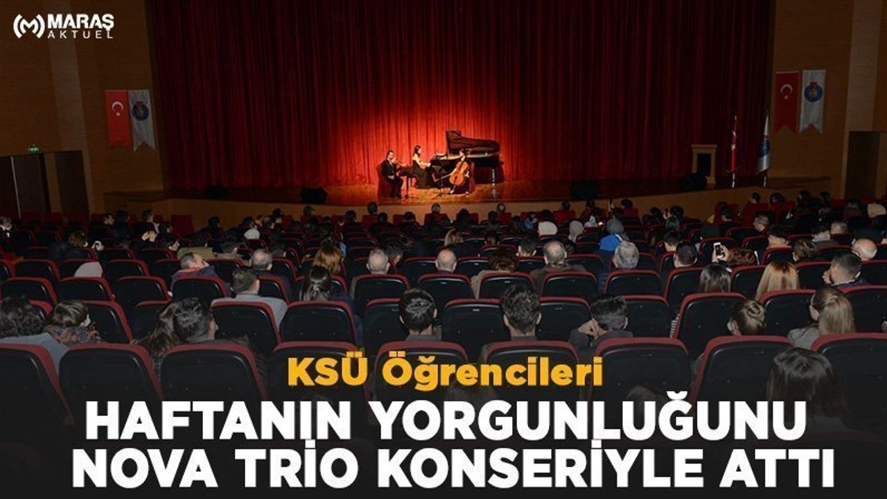KSÜ Yunus Emre Kongre ve Kültür Merkezi Sezai Karakoç Konferans Salonunda gerçekleştirilen konser etkinliğinin açılış konuşmasının KSÜ Rektörü Prof. Dr. Niyazi Can yaptı. Haftanın yorgunluğunu atmak için düzenlenen Nova Trio oda müziği konserinde öğrencilerle bir arada olmaktan duyduğu memnuniyeti dile getiren Rektör Can, önümüzdeki günlerde yine bu tarz etkinliklere ev sahipliği yapmayı sürdüreceklerini ifade etti. KSÜ Rektörü Can’ın açılış konuşmaları ardından Çetin Ceviz, Ecem Alnıaçık ve Seren Karabey'den oluşan Nova Trio birbirinden güzel eserleri sanatseverlerin beğenisine sundular. Büyük beğeni toplayan konser performansı ardından KSÜ Rektörü Can tarafından Nova Trio üyelerine teşekkür belgeleri takdim edildi.