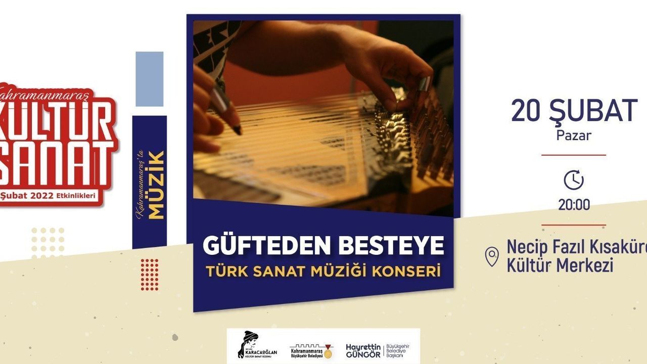 Şubat Kültür Sanat Etkinlikleri kapsamında 20 Şubat Pazar günü gerçekleştirilecek diğer bir etkinlikte ise ‘Güfteden Besteye’ isimli Türk Sanat Müziği konseri dinleyicilerle buluşacak. Necip Fazıl Kısakürek Kültür Merkezi’nde düzenlenecek olan konser saat 20.00’da başlayacak. Kültür, Spor ve Turizm Dairesi Başkanlığı’nda yapılan açıklamada, düzenlenen etkinliklere tüm vatandaşlar davet edildi.