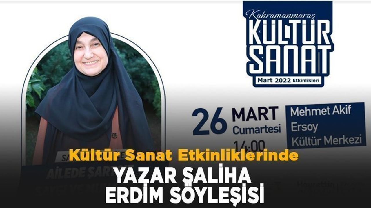 Kahramanmaraş Büyükşehir Belediyesi Mart Kültür Sanat Etkinlikleri kapsamında tiyatro gösterilerinden konserlere, söyleşiden konferansa kadar çeşitli programlar kültür sanat dostlarıyla buluşuyor. Alanında uzman konuklar Kahramanmaraşlılarla bir araya gelerek, eğitici ve öğretici programlar düzenliyor. Bu kapsamda, Yazar Saliha Erdim, 26 Mart Cumartesi günü (yarın) sanatseverlerle buluşacak. Mehmet Akif Ersoy Kültür Merkezi’nde gerçekleştirilecek etkinlik saat 14.00’da başlayacak. ‘Ailede Şartsız Saygı ve Muhabbet’ konusunun işleneceği programa tüm vatandaşlar davet edildi.