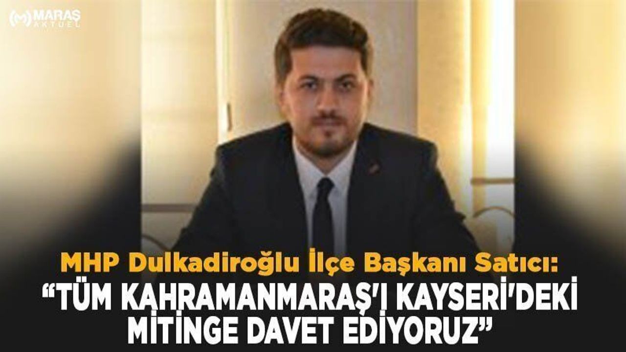 18 Eylül Pazar günü Kayseri'de düzenlenecek olan miting öncesi MHP Dulkadiroğlu İlçe Başkanı Ömer Emrah Satıcı, Kahramanmaraş halkını Kayseri'ye davet etti. Başkan Satıcı, "Tüm Kahramanmaraş halkını Pazar günü gerçekleşecek olan Kayseri mitingimize davet ediyorum. Mitinge katılacak vatandaşlar için ücretsiz ulaşım sağlanacaktır. Katılım sağlamak isteyen vatandaşlarımız için irtibat numaralarımız; Al Rıza Gedemenli 05392600184, Mehmet Gözalıcı 05065975233, Kubilay Keskin 05327741630 Numaralarından irtibata geçebilirler. 18 Eylül Pazar günü MHP İl Başkanlığı önü şelale park karşısından saat 09.00’da yola çıkacağız" dedi.