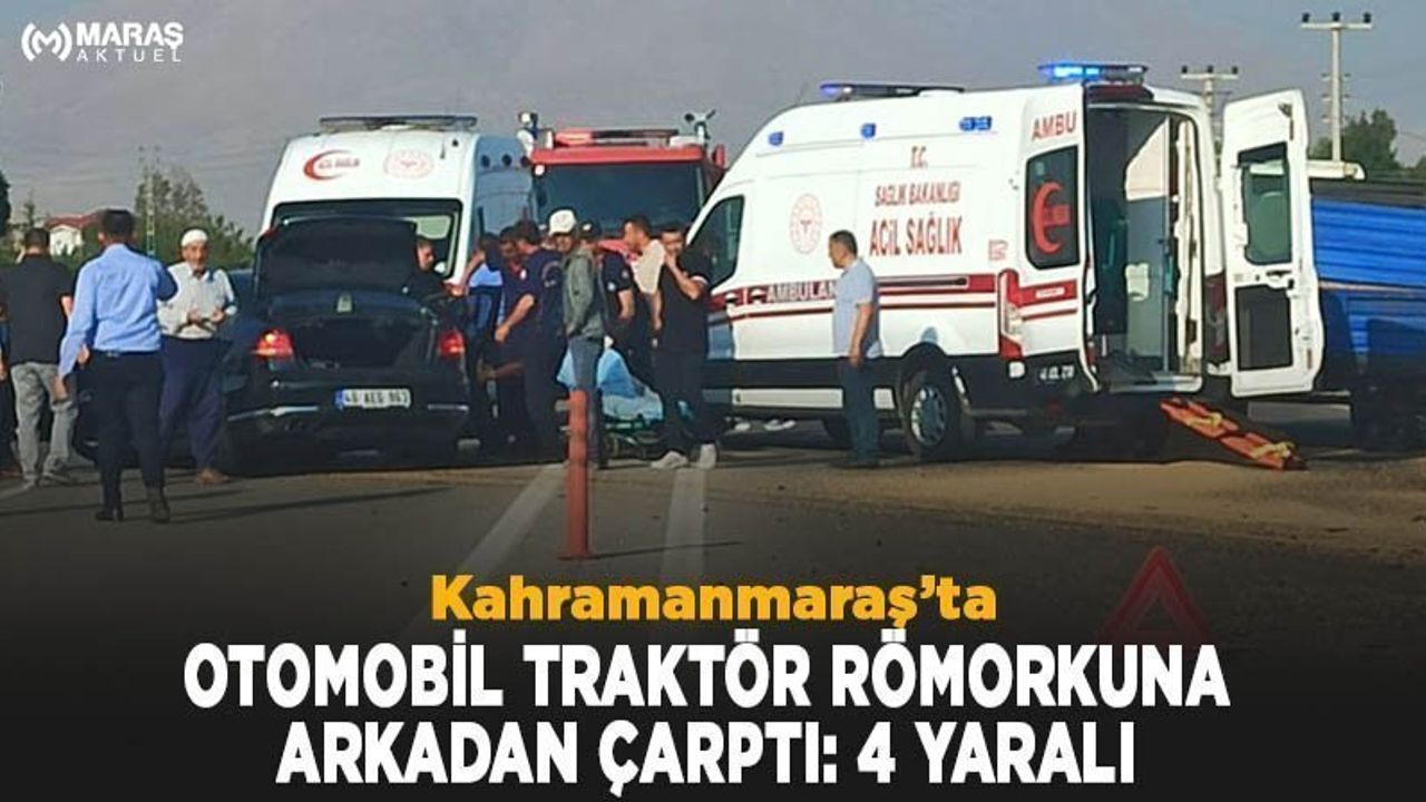 Edinilen bilgiye göre, Nevzat Ö.(50) yönetimindeki 46 AEG 963 plakalı otomobille seyir halinde iken Çiçek Mahallesinde aynı istikamette seyreden Özcan İ.’nin (20) idaresindeki 46 F 2668 plakalı traktör römorkuna arkadan çarptı. Çarpmanın şiddetiyle sürücü ile birlikte yanında bulunan toplam 4 kişi yaralandı. Yaralılar ihbar üzerine olay yerine gelen sağlık ekipleri tarafından Elbistan Devlet Hastanesi’ne kaldırılarak tedavi altına alındı.