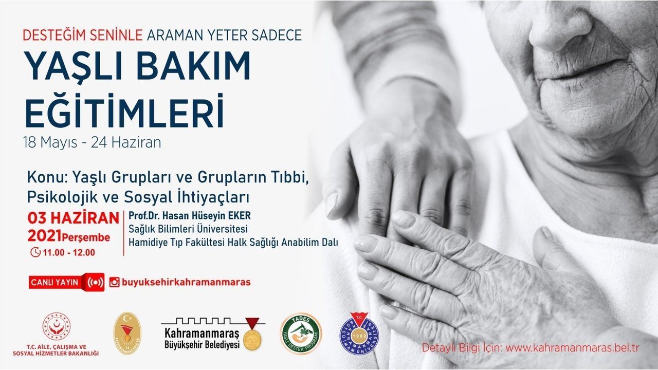 Kahramanmaraş Büyükşehir Belediyesi’nin katkılarıyla düzenlenen ‘Yaşlı Bakım Eğitimleri’ seminerleri devam ediyor. Aile Çalışma ve Sosyal Hizmetler İl Müdürlüğü, Kahramanmaraş Valiliği ve Sütçü İmam Üniversitesi işbirliğiyle düzenlenen seminerin konuğu Sağlık Bilimleri Üniversitesi Hamidiye Tıp Fakültesi Halk Sağlığı Anabilim Dalı Başkanı Prof. Dr. Hasan Hüseyin Eker olacak. 3 Haziran Perşembe günü (yarın) 11.00 – 12.00 saatleri arasında gerçekleştirilecek olan program Büyükşehir Belediyesi’nin Instagram hesabından canlı yayınlanacak. Gerçekleştirilecek programda yaşlılık döneminde ortaya çıkan hastalıklar, yaşlıların yaşadığı psikolojik sorunlar ve çözüm önerileri gibi pek çok konu masaya yatırılacak.