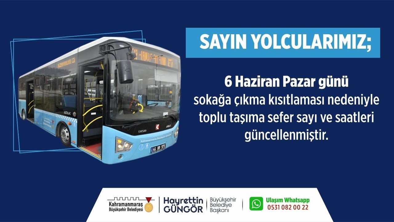 Kahramanmaraş Büyükşehir Belediyesi toplu taşıma araçlarının sefer sayı ve saatlerinde güncellemeye gitti. İçişleri Bakanlığı tarafından yayınlanan genelge kapsamında 6 Haziran Pazar günü sokağa çıkma kısıtlamasında toplu taşıma hatları hizmet vermeyi sürdürecek. 6 Haziran Pazar günü 2, 3, 4, 5, 7, 8, 9 10, 11, 12, 13, 15/A, 17, 18, 21, 22, 23, 24, 25, 28, 29, 30, 32/B, 33, 34, 34/B, 35, 36/B, 38 ve 44 numaralı seferler ulaşım sağlayacak. Ulaşım Hizmetleri Dairesi Başkanlığı’ndan kısıtlılık süresince çalışan sefer saatlerine