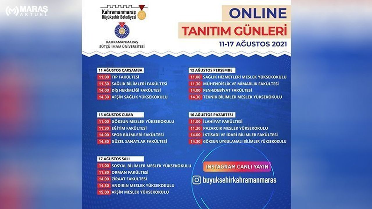 Kahramanmaraş Büyükşehir Belediyesi, Kahramanmaraş Sütçü İmam Üniversitesi işbirliğiyle kentteki eğitim olanaklarını öğrenci adaylarına tanıtıyor. KSÜ’de bulunan fakülte ve yüksekokulların tanıtılacağı programlar Büyükşehir Belediyesi instagram hesabından canlı yayınlanacak. 11 Ağustos Çarşamba (bugün) başlayan tanıtım günleri, 17 Ağustos Salı gününe kadar devam edecek. Fakülte ve yüksekokullarda bulunan lisans ile önlisans programlarının tanıtılacağı yayınlarda, kampüs ve yurt imkânlarından ulaşıma kadar pek çok başlık konuşuluyor.