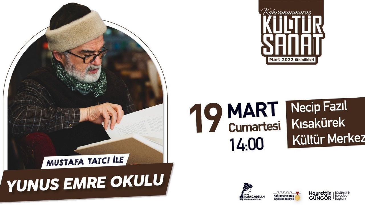 Kahramanmaraş Büyükşehir Belediyesi Mart Kültür Sanat Etkinlikleri, birbirinden renkli programlarla hız kesmeden devam ediyor. Etkinlik takvimi kapsamında, Mart ayı boyunca tiyatro gösterilerinden konserlere, söyleşiden konferansa pek çok program sanatseverlerle buluşuyor. Bu kapsamda, 19 Mart Cumartesi günü (yarın) Türkçe’nin en büyük şairlerinden Yunus Emre’yi en iyi anlayan ve anlatan yazarlardan Mustafa Tatcı söyleşisi gerçekleştirilecek. Necip Fazıl Kısakürek Kültür Merkezi’nde düzenlenecek etkinlik saat 14.00’da başlayacak.