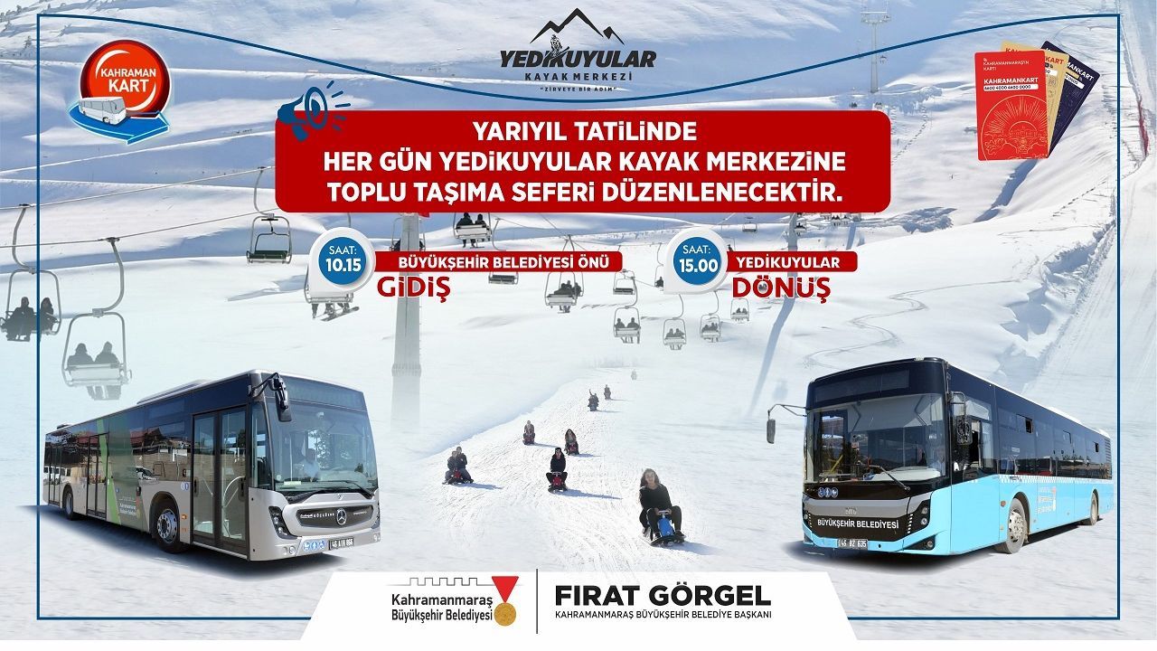 Kahramanmaraş Büyükşehir Belediyesi, kış turizminin gözde adreslerinden Yedikuyular Kayak Merkezi’ne ulaşımı kolaylaştırmak için yarıyıl tatili boyunca otobüs seferleri düzenleyecek. Tatil boyunca her gün gerçekleştirilecek seferlerle, kayak tutkunları ve doğaseverler için çift yönlü ulaşım imkânı sağlanacak. Seferler, saat 10.00’da Büyükşehir Belediyesi önündeki otobüs durağından başlayacak. Kayak ve doğa keyfi yaptıktan sonra dönüş yapmak isteyen vatandaşlar için ise otobüsler saat 15.00’da Yedikuyular Kayak Merkezi’nden geri dönecek. Vatandaşlar, bu hizmet sayesinde özel araç ihtiyacı duymadan rahat bir şekilde kayak merkezine ulaşabilecek.