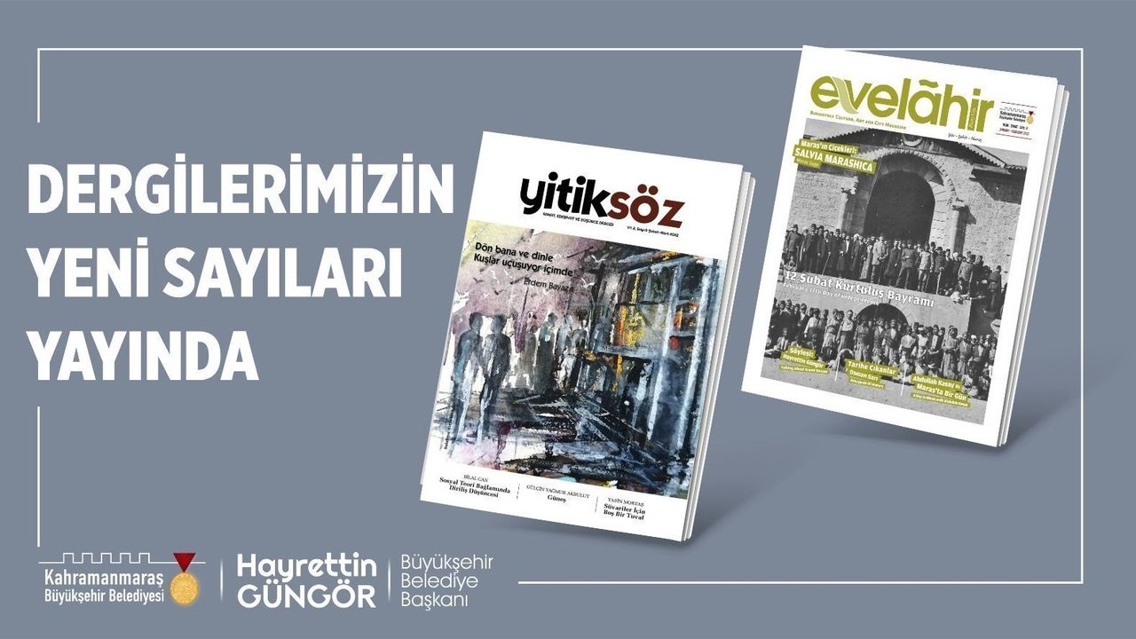 Kahramanmaraş Büyükşehir Belediyesi, şehrin kültür sanat envanterine yeni ürünler kazandırmaya devam ediyor. Bu kapsamda, Kültür Yayınları’ndan olan Yitiksöz ve Evelahir dergileri yeni sayısıyla okurla buluştu. Şehrin kültür ve sanat dergisi olan Evelahir’in yeni sayısında Maraş’ın Milli Mücadelesi, Kahramanmaraş’taki doğal turizm alanları, yöresel lezzetler, Kahramanmaraş’ın tarihi çarşıları, kültür sanat etkinlikleri gibi pek çok konu farklı açılardan ele alınıyor. Edebiyat ve düşünce dergisi olan Yitiksöz’de ise; Adem Turan, Hayrettin Orhanoğlu, Bilal Can, Erol Çetin gibi usta yazarların kalemlerinden çıkan eserler yer alıyor. Dergilerin yeni sayıları Büyükşehir Belediyesi Kültür ve Turizm Şube Müdürlüğü, Yedi Güzel Adam Edebiyat Müzesi ve Necip Fazıl Kültür Merkezi’nden ücretsiz olarak temin edilebiliyor. Ayrıca okuyucular dergilerin aktüel ve geçmiş sayılarına da e dergi formatında